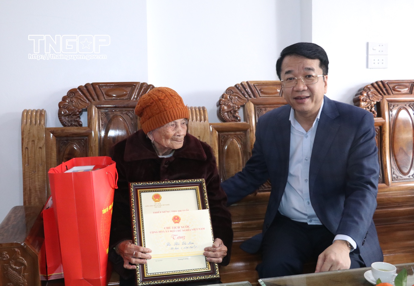 Đồng chí Nguyễn Thanh Bình, Phó Bí thư Tỉnh ủy tặng quà cho bà Hà Thị Ban, người cao tuổi (100 tuổi) ở xóm Kê, xã Tân Khánh (ảnh: TNGOP)