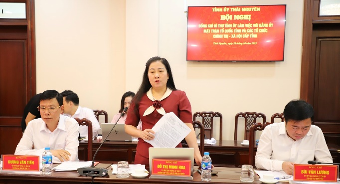 Đồng chí Đỗ Thị Minh Hoa, Ủy viên Ban Thường vụ, Trưởng ban Tuyên giáo và Dân vận Tỉnh ủy phát biểu tại Hội nghị