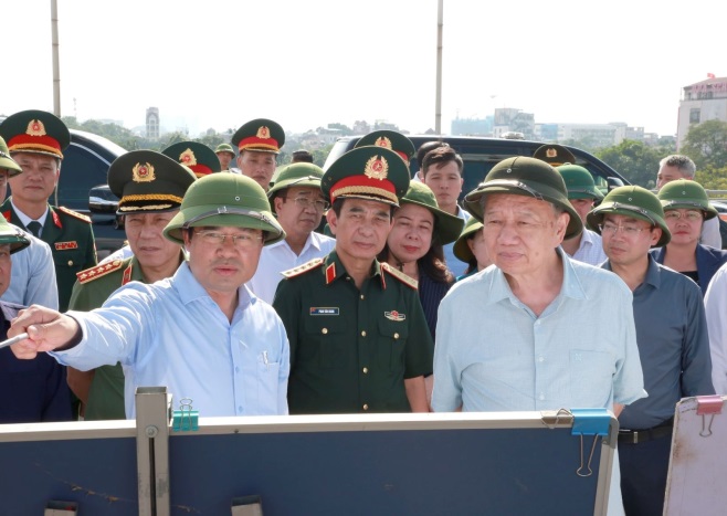 Tại hiện trường khu vực cầu Bến Tượng (phường Phan Đình Phùng) - một trong những vị trí xung yếu trong công tác phòng, chống lũ trên địa bàn tỉnh, Tổng Bí thư Tô Lâm đã trực tiếp thị sát thực tế hai bên bờ sông Cầu; nghe đồng chí Bí thư Tỉnh ủy Trịnh Xuân Trường trình bày bản đồ ngập lụt hạ du trên sông Cầu, báo cáo về công tác khắc phục hậu quả bão số 11 và phương án xây dựng hệ thống công trình đê điều, phòng, chống lũ lụt hai bên bờ sông Cầu đoạn qua trung tâm tỉnh Thái Nguyên.
