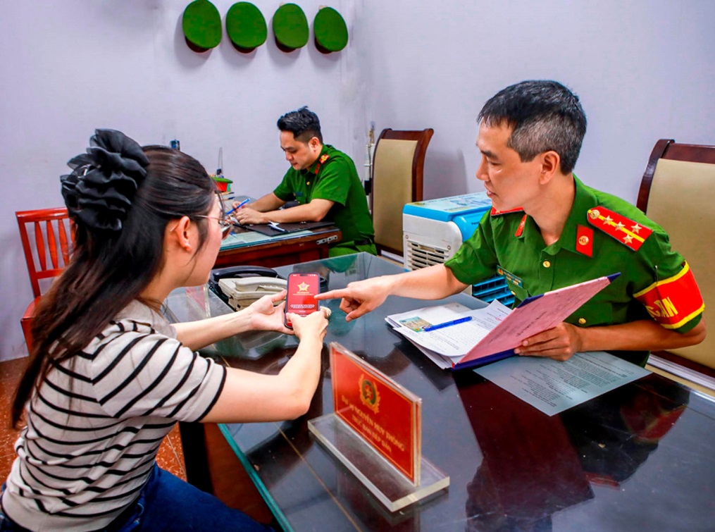 Cán bộ, chiến sĩ công an nhân dân hướng dẫn người dân cài đặt VNeID _Nguồn: nhiepanhdoisong.vn