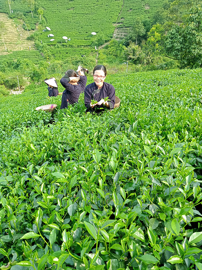 Rời không gian thưởng trà và khu vực sản xuất, chúng tôi diện cho mình bộ quần áo của đồng bào dân tộc, đeo gùi, đội nón tham gia hoạt động trải nghiệm hái chè cùng bà con. Những nương chè búp vươn tua tủa, xanh mướt trải dài bên sườn núi, không khí trong lành, mát mẻ, vang vọng đâu đó tiếng róc rách của dòng suối Kẹm chảy quanh, thậm chí đôi lúc tôi còn cảm nhận được tiếng ào ào của dòng thác ở trên đỉnh non xanh Tam Đảo khiến chúng tôi choáng ngợp và vô cùng thích thú. Nhanh tay hái những búp chè non xanh, thi thoảng check in vài kiểu ảnh làm kỷ niệm, trò chuyện với bà con làm chè mộc mạc, chân chất nhưng vô cùng hiếu khách đã để lại trong chúng tôi những trải nghiệm khó quên.