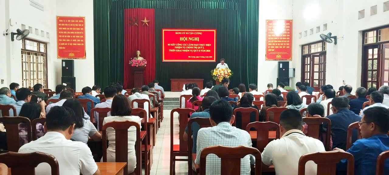 * Tại Hội nghị sơ kết công tác lãnh đạo thực hiện nhiệm vụ chính trị quý I, triển khai nhiệm vụ quý Il, năm 2026 của Đảng bộ xã Tân Cương, các đại biểu nghe và cho ý kiến vào các nội dung liên quan đến công tác lãnh đạo, chỉ đạo phát triển kinh tế - xã hộ, xây dựng Đảng. Theo đó, trong quý I, Đảng bộ xã đã lãnh đạo, chỉ đạo triển khai đồng bộ các nhiệm vụ và đạt nhiều kết quả tích cực trên các lĩnh vực, thu ngân sách đạt trên 50% kế hoạch; các dự án đầu tư công được đôn đốc triển khai; công tác quản lý đất đai, tài nguyên, môi trường được tăng cường. Các hoạt động văn hóa, an sinh xã hội được quan tâm, nổi bật là chương trình chăm lo Tết cho người nghèo và tổ chức thành công các lễ hội truyền thống.