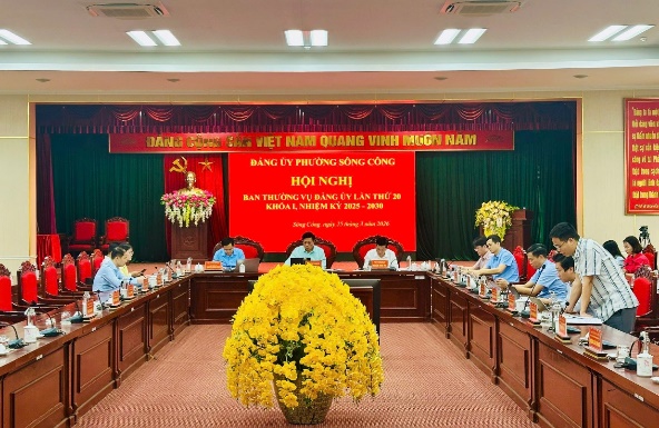 * Tại Hội nghị Ban Thường vụ Đảng ủy phường Sông Công lần thứ 20, khóa I, nhiệm kỳ 2025 - 2030, các đại biểu đã thảo luận, cho ý kiến đối với nhiều nội dung quan trọng liên quan đến kết quả lãnh đạo thực hiện nhiệm vụ phát triển kinh tế - xã hội, bảo đảm quốc phòng - an ninh, công tác xây dựng Đảng và hệ thống chính trị quý I; đồng thời triển khai nhiệm vụ quý II năm 2026.