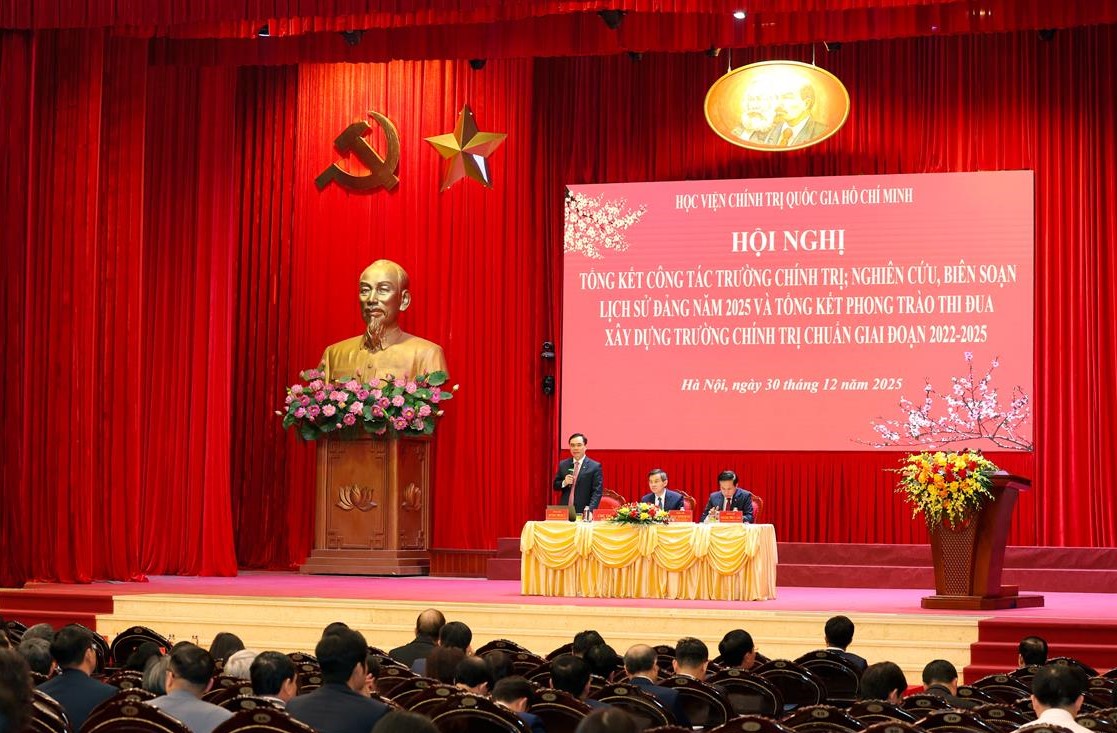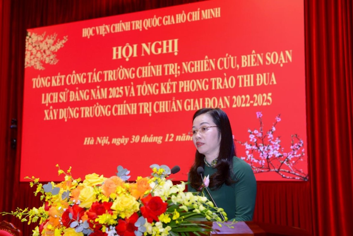 Phát biểu tại hội nghị, PGS,TS Đoàn Minh Huấn, Ủy viên Trung ương Đảng, Phó Giám đốc Thường trực Học viện đã ghi nhận, biểu dương những kết quả quan trọng đạt được trong công tác trường chính trị và công tác nghiên cứu, biên soạn lịch sử Đảng trong năm 2025; đồng thời nhấn mạnh yêu cầu tiếp tục đổi mới tư duy, tầm nhìn và phương thức tổ chức thực hiện trong công tác trường chính trị và công tác nghiên cứu, biên soạn lịch sử Đảng tập trung vào một số nhiệm vụ trọng tâm: Tiếp tục xây dựng trường chính trị chuẩn theo hướng thực chất, chú trọng chất lượng, tránh hình thức, đổi mới mạnh mẽ công tác đào tạo, bồi dưỡng, nghiên cứu khoa học và tổng kết thực tiễn; tăng cường lãnh đạo, chỉ đạo công tác lịch sử Đảng đáp ứng yêu cầu tình hình mới, coi nghiên cứu, biên soạn, tuyên truyền, giáo dục lịch sử Đảng là nhiệm vụ chính trị quan trọng; đổi mới hình thức tuyên truyền, nhất là hướng tới thế hệ trẻ thông qua nền tảng số, mạng xã hội; kiện toàn đội ngũ cán bộ làm công tác lịch sử Đảng theo nguyên tắc “đúng người, đúng việc”.