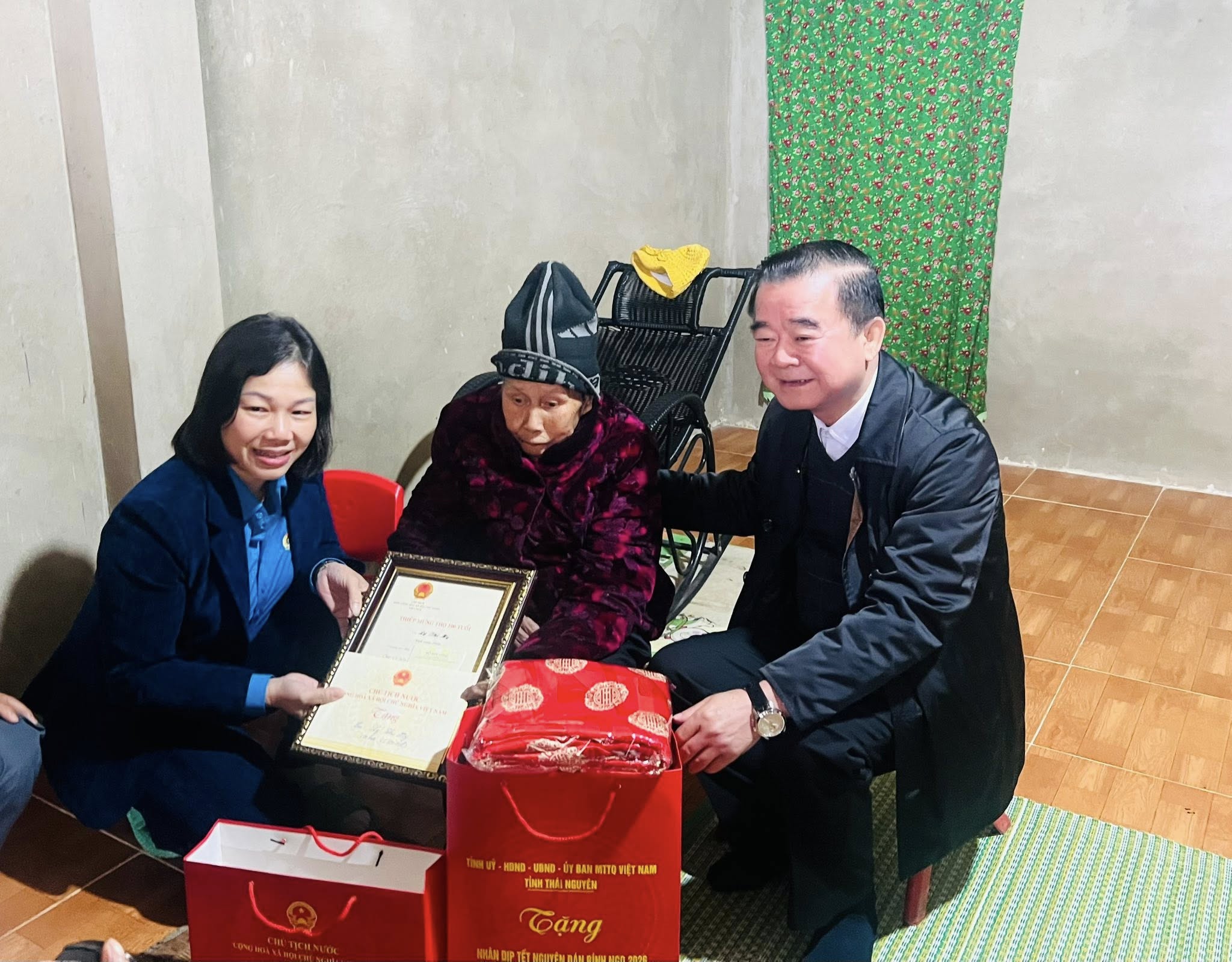 Đoàn công tác đến thăm, tặng quà 3 hộ gia đình chính sách, người có công, người cao tuổi, gồm: bà Lý Thị Khào, vợ Liệt sĩ Dương Văn Tu, ở xóm Kim Sơn; bà Lương Thị Văn, vợ Liệt sĩ Nông Văn Thinh, ở xóm Trung Sơn; bà Trần Thị Chấm, là người cao tuổi trú tại xóm Xuyên Sơn.